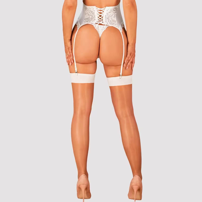 Ženstvene i elegantne čarape iz kolekcije S814 su veoma seksi dodatak koji fantastično naglašava izgled nogu. Bela, glatka završna obrada lepo ukrašava butine i dodaje eleganciju, a bež mreža savršeno pristaje uz telo. Zajedno sa odgovarajućim kaišem za podvezice, stvorićete ansambl koji je pun seksualnog privlačnosti kako u spavaćoj sobi tako i za svakodnevno nošenje.