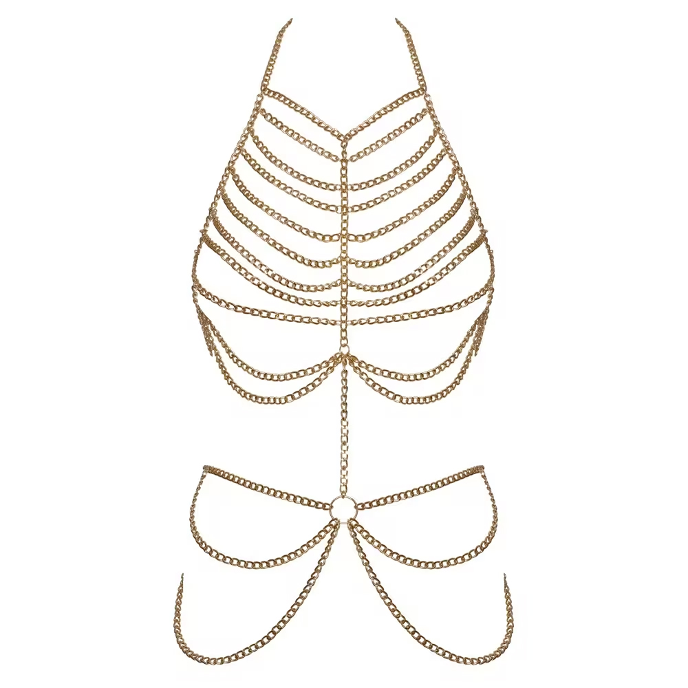 Lanac za telo zlatne boje od Cottelli . Može se nositi samostalno kao donje rublje za erotski izgled ili sa stilom u kombinaciji sa kupaćim kostimima i pripijenom odećom – ovaj glamurozni nakit za telo uvek će privlačiti poglede!