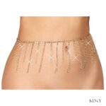 Lanac za telo zlatne boje od Cottelli . Može se nositi samostalno kao donje rublje za erotski izgled ili sa stilom u kombinaciji sa kupaćim kostimima i pripijenom odećom – ovaj glamurozni nakit za telo uvek će privlačiti poglede!