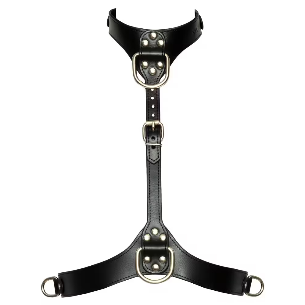 Grudni pojas od Bad Kitty u elegantnom izgledu crne kože, sa metalik detaljima srebrne boje. Dobro je izrađen i podesiv zahvaljujući višestrukim kopčama. Ogrlica i kaiš za grudi su opremljeni čvrstim D-prstenovima sa ukrasnim čavlima za pričvršćivanje dodatne opreme.