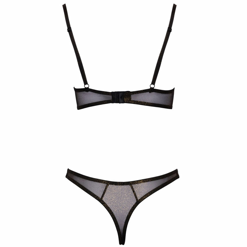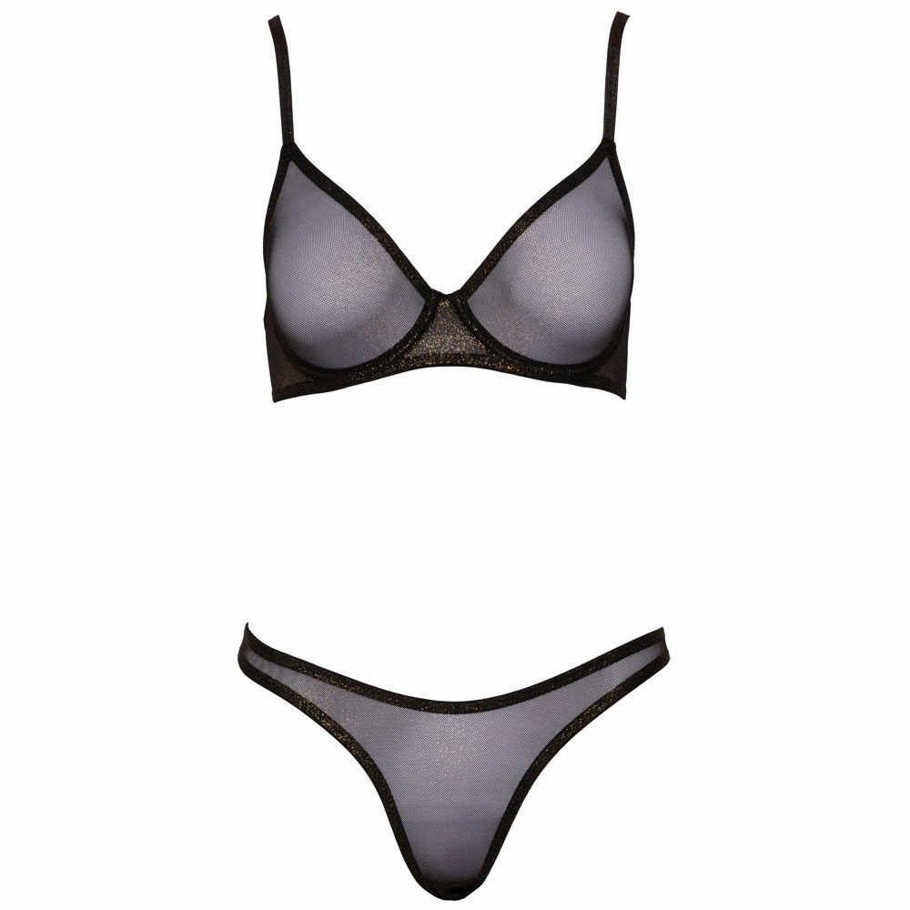 Grudnjak sa žicom i kanap u kompletu Cottelli LINGERIE napravljeni su od delikatne, crne mreže sa svetlucavim zlatnim šljokicama.