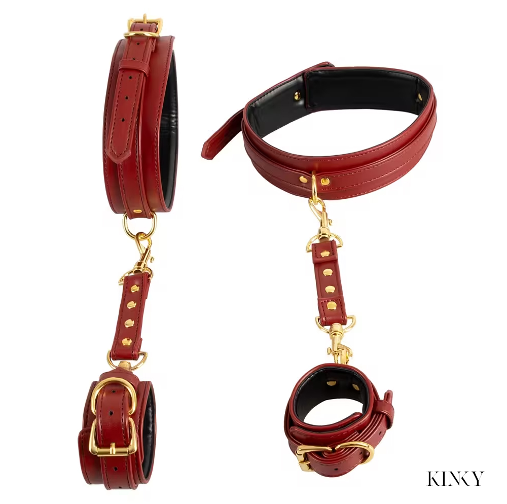 Lisice i držači za butine od Bad Kitty od prelepe crvene imitacije kože sa metalnim detaljima zlatne boje. Blago postavljene, podesive trake za butine i zglobove mogu se spojiti pomoću uklonjivih kaiševa sa kopčom. 1 par.