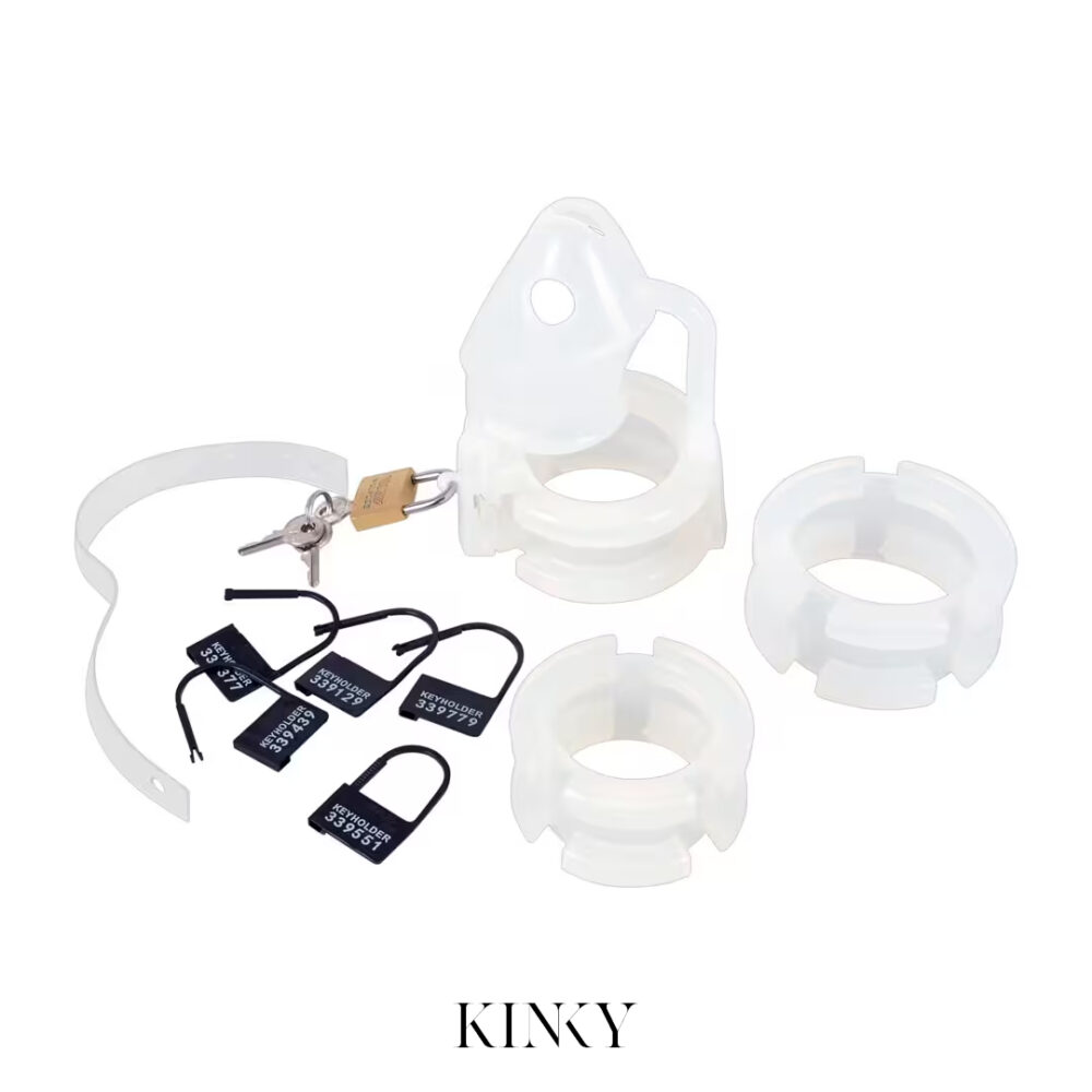 Pojas čednosti je veoma lagan i udoban u poređenju sa metalnim kavezima. Sveobuhvatan set uključuje ukupno 15 komada: 1 kaiš , 3 prstena, 2 petlje sa rupama, 1 čep, 1 metalnu bravu sa 2 ključa, 5 numerisanih plastičnih brava.