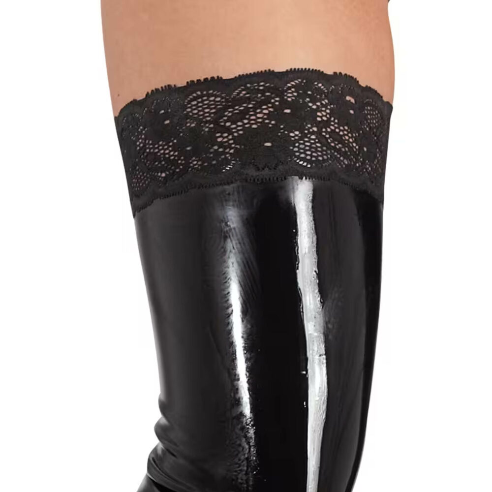 Raskošni lateks! Lateks čarape do butina sa lateksom na vrhu i čipkastim dizajnom.