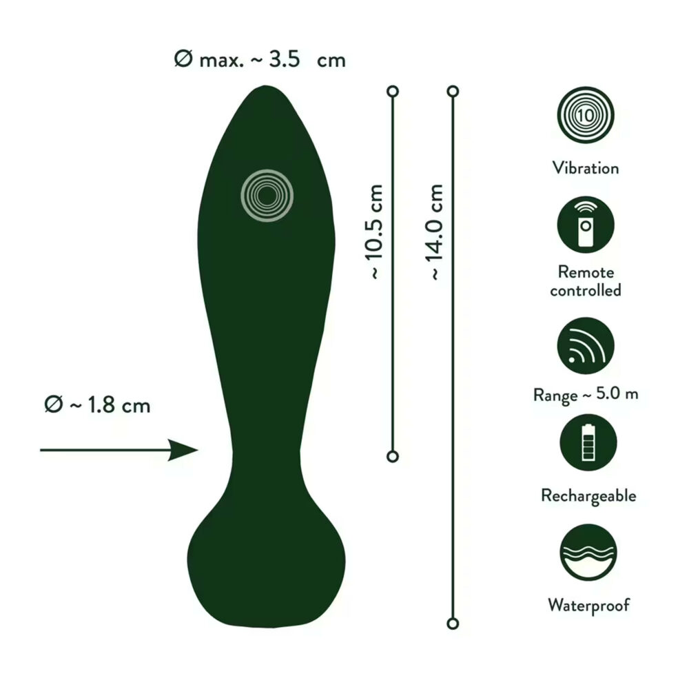 Moćan i pouzdan motor pruža 10 različitih režima vibracije. Mali daljinski upravljač može se koristiti za podešavanje režima pritiskom na dugme. Daljinski upravljač može koristiti i partner jer ima domet od 5 metara. Luksuzni RC analni čep se takođe može koristiti u kadi, bazenu ili tušu za duboku i vibrirajuću analnu zabavu jer je vodootporan! Vibracije se takođe mogu podesiti direktno na čepu, što znači da se može koristiti i za druge vrste stimulacije.