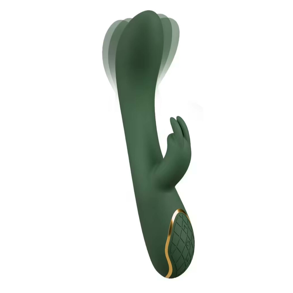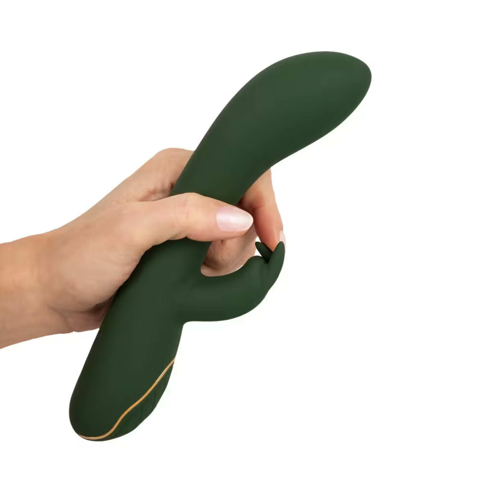 Luksuzni vibrator od Emerald Love by You2Toys je savršen za dvostruku stimulaciju – može istovremeno stimulisati vaginu i klitoris. Velik je i senzualno zakrivljen tako da lako može doći do G-tačke. Takođe je divno fleksibilan, što znači da se može prilagoditi intimnim konturama tokom sinhronizovane stimulacije. Napravljen je od baršunasto mekog silikona za lako umetanje i maksimalnu udobnost tokom zadovoljstva. Luksuzni vibrator Zec je u elegantnom smaragdno zelenom dizajnu i takođe ima upečatljive zlatne detalje. Njegova dijamantska tekstura na dršci znači da ga je lako držati, a dugmad ga takođe olakšavaju upotrebu.