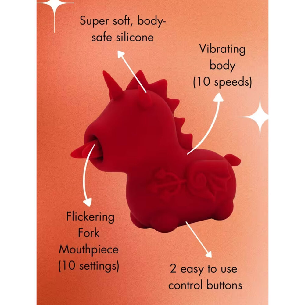Slatki vibrator Blaze Diablo (vibrator sa jezičkom) koji se nanosi od Unihorn-a je u obliku malog jednoroga. Mekana, lako držati silikonska igračka pruža magiju ljuljanja između butina. Njen meki, mali, dvostruki jezičak se izuzetno brzo pomera gore-dole i napred-nazad kako bi zadovoljio klitoris. Štaviše, intenzivne vibracije podržavaju ovu jedinstvenu stimulaciju. Tihi, luksuzni dvostruki motor pruža pouzdanu snagu. 10 različitih režima za kretanje jezika i vibracije mogu se kontrolisati odvojeno pritiskom na dugme. Magična igračka za raznovrsnu igru – sami ili sa partnerom, kod kuće ili u pokretu!