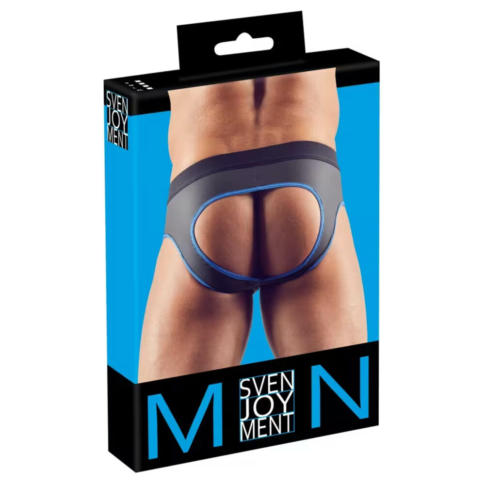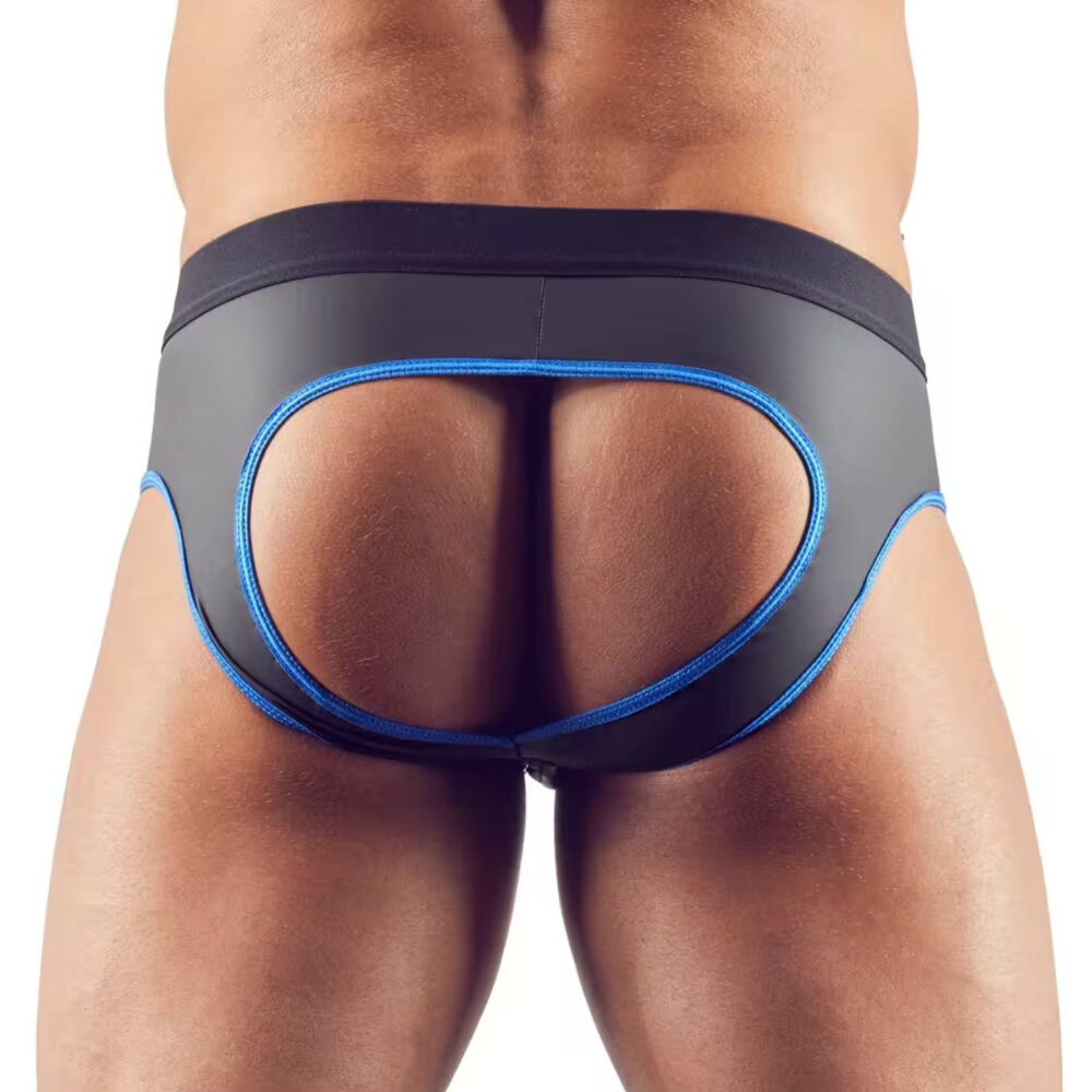 Muške gaće napravljen od sjajnog mat materijala u uzbudljivom neoprenskom/gumenom izgledu. Otvoren je pozadi za uzbudljivu zabavu. Rajsferšlus napred poziva na interaktivno iskustvo.