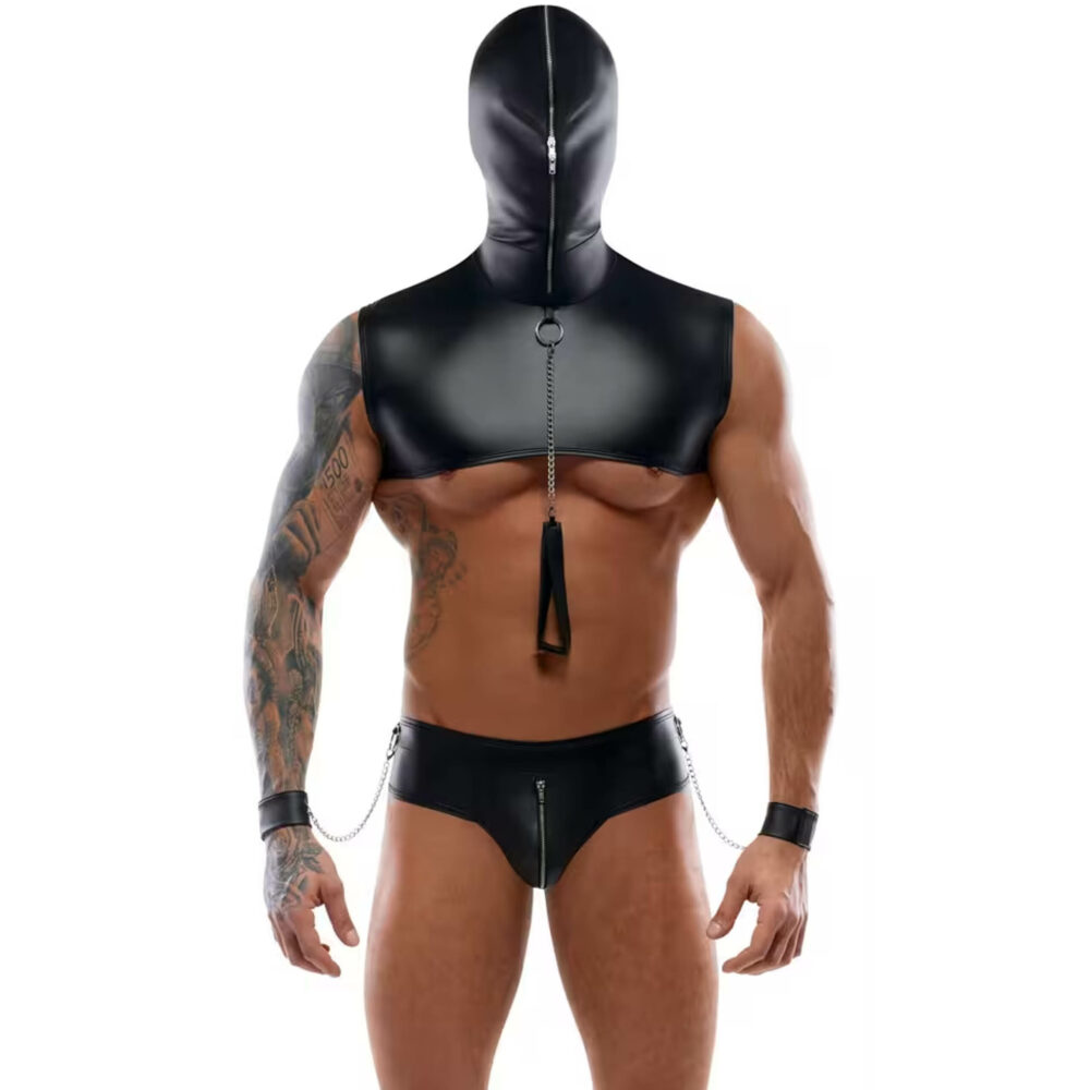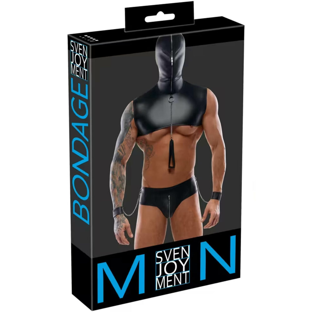 Kratka majica sa kapuljačom, tange, povodac i 2 manžetne za zglob u kompletu Svenjoiment BONDAGE. Plemeniti crni mat izgled leži blizu kože. Gornji deo pokriva samo gornji deo grudi i ima pametnu kapuljaču koja se može potpuno zatvoriti dvosmernim patentnim zatvaračem – savršeno zatvarajući glavu. Priloženi povodac se može pričvrstiti na prsten na prednjem delu vrata pomoću kopče. Tange imaju rajsferšlus ispod. Priložene manžetne za ručne zglobove mogu se pričvrstiti na prsten sa svake strane pojasa pomoću praktičnih lančića. Podesivi zatvarači na kopče na držačima omogućavaju ugodne igre vezanja.