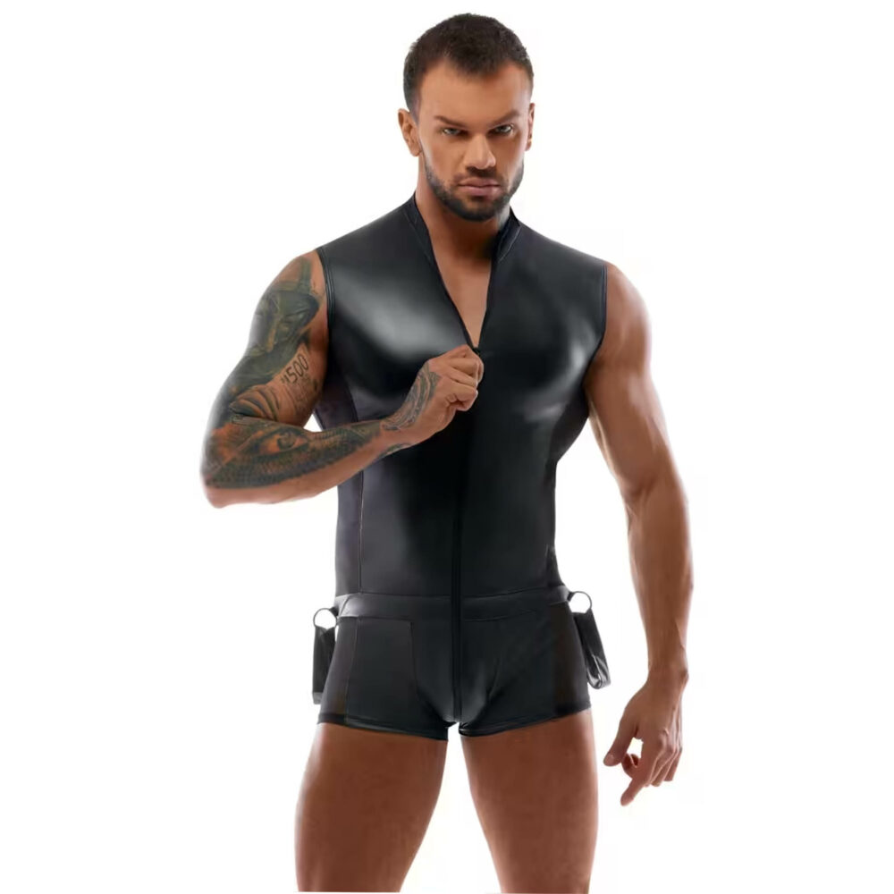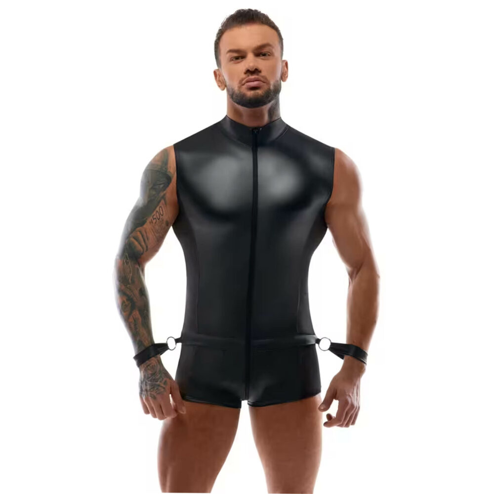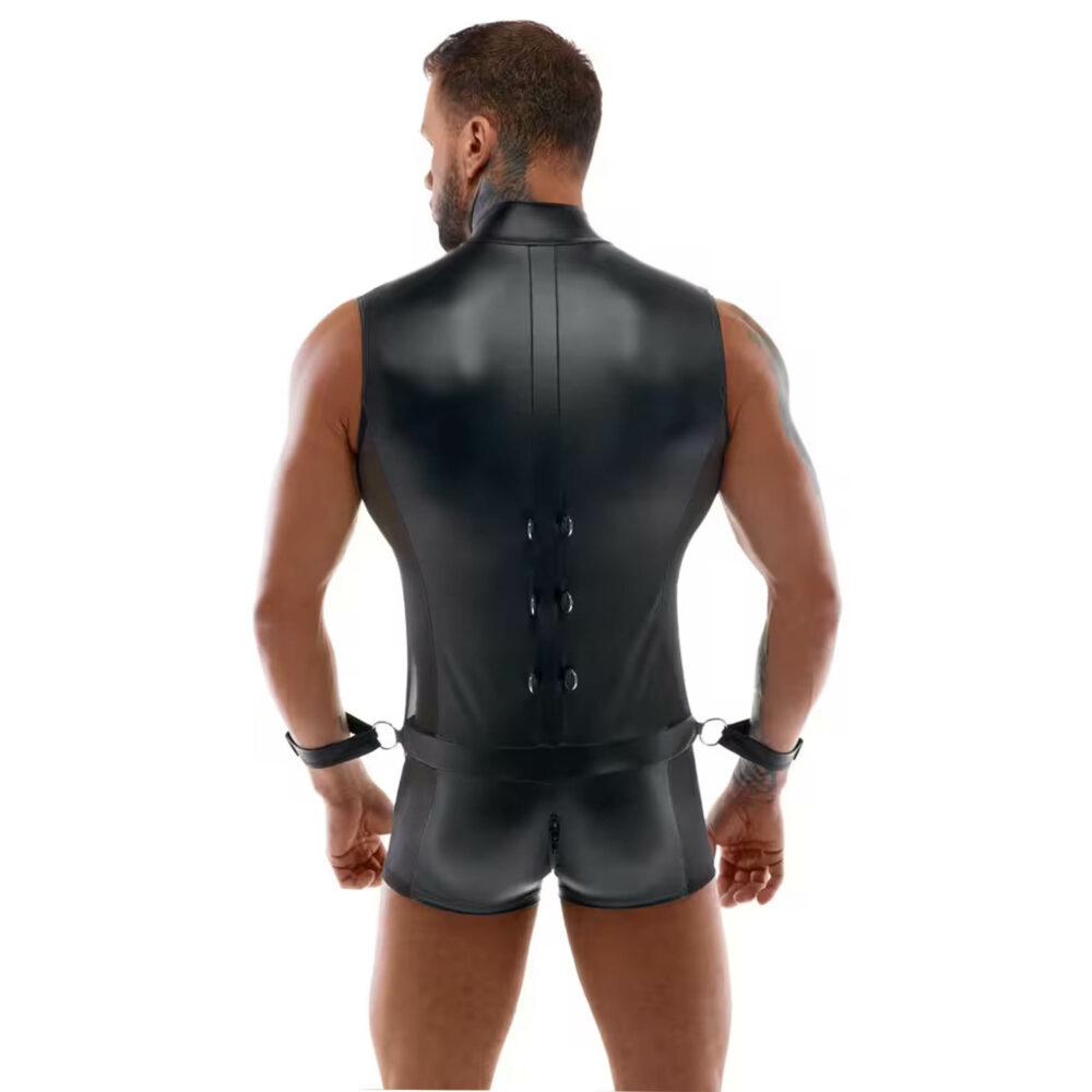 Kombinezon bez rukava sa 2 lisice za zglobove u setu od Svenjoyment BONDAGE. Elegantan crni mat izgled prijanja uz kožu. Sa mrežastim umetcima na kratkim nogavicama za uzbudljiv pogled. Prednja strana ima rajsferšlus koji ide od stojeće kragne do pojasa. Futrola ima donji rajsferšlus. Svaka strana pojasa ima prsten za pričvršćivanje priloženih lisica za zglobove. Njihove podesive čičak trake čine ove mekane lisice brzim za upotrebu za prijatne igre vezivanja. Leđa imaju 6 dodatnih prstenova za više opcija vezivanja.