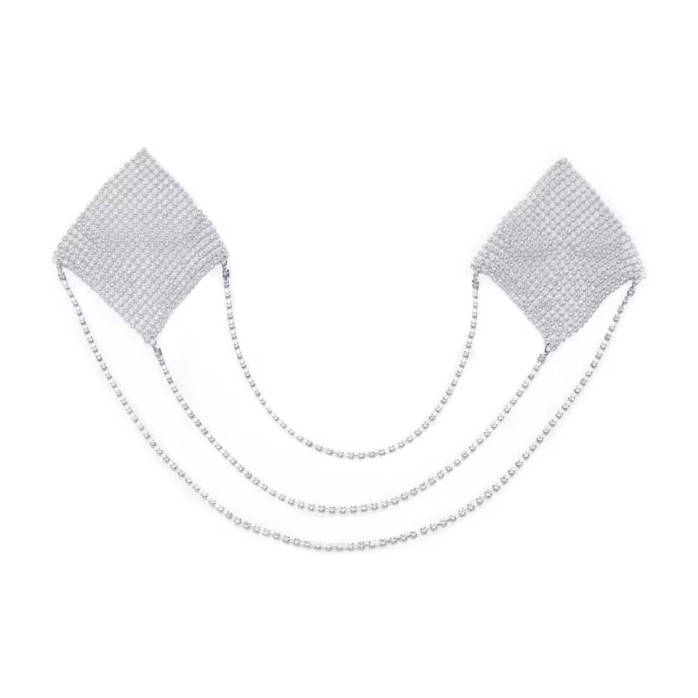 Srebrne kvadratne nalepnice za bradavice od Cottelli ACCESSOIRES su u sjajnim i blistavim dijamantskim oblicima sa tri nežna, lelujava lanca za povezivanje. Nalepnice za bradavice se lako lepe – mogu se koristiti i više puta ako se zaštitna folija ponovo nanese pre skladištenja.