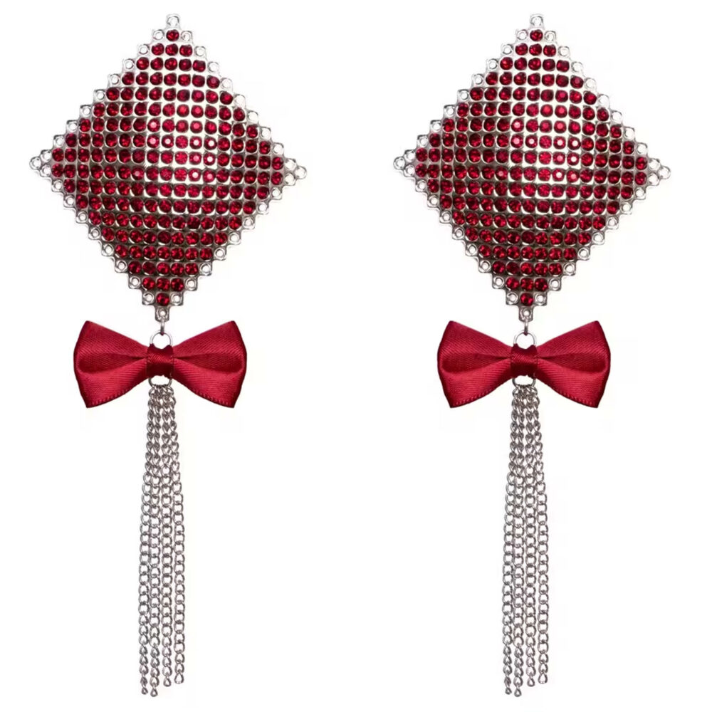 Nalepnice u obliku mašne za bradavice od Cottelli ACCESSOIRES su složenog dizajna. Ove nalepnice u obliku dijamanta, napravljene od sjajnih crvenih dragulja, mogu prekriti bradavice. Vijugavi lanci i crvene satenske mašne su dodatni ukrasi. Lako se lepe i mogu se koristiti više puta ako se zaštitna folija ponovo nanese pre skladištenja.
