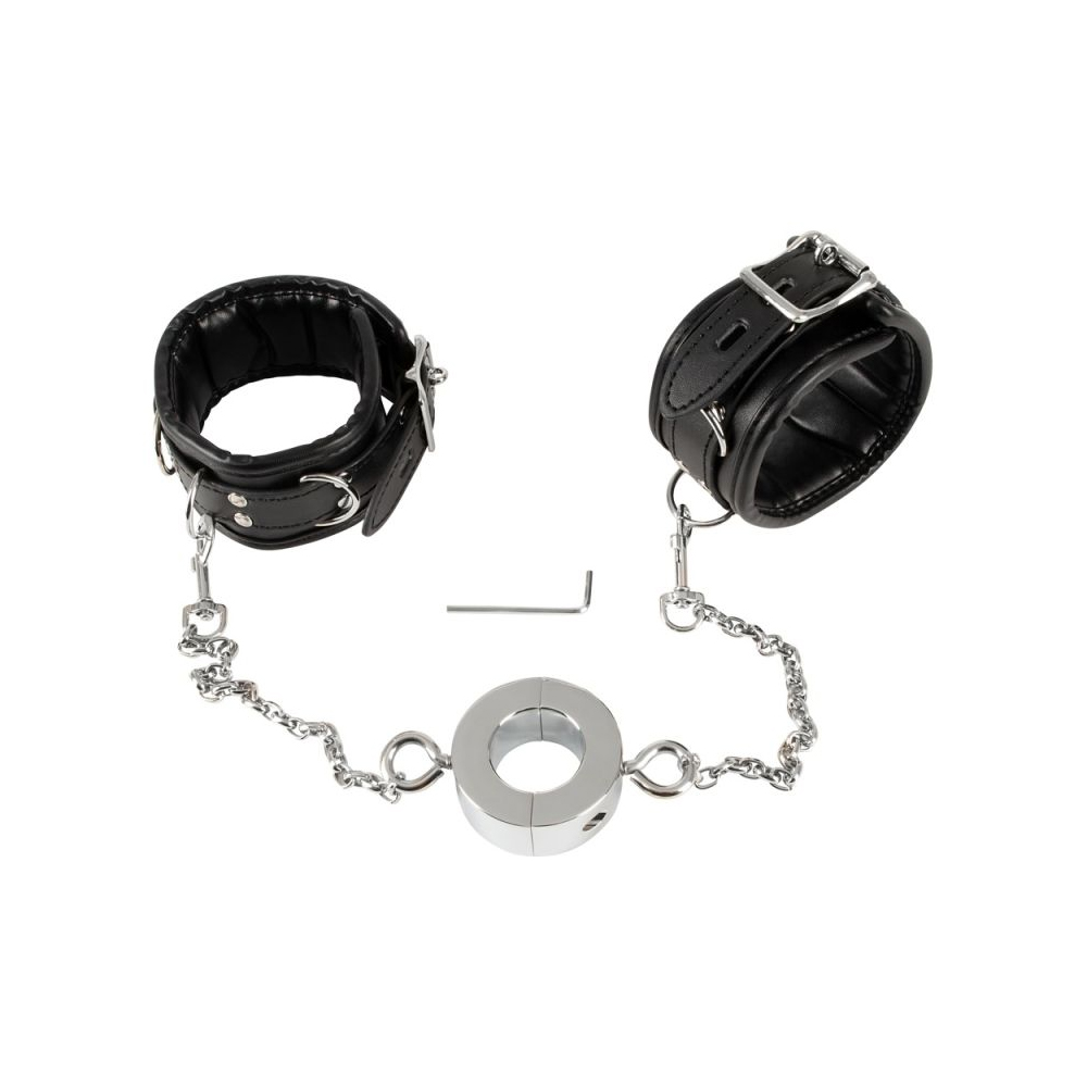 Lisice sa prstenom za penis od nerđajućeg čelika, sa dva čvrsto zaključana, kratka lanca. Meko posstavljene lisice u elegantnom izgledu kože su podesive pomoću kopči. Prsten za penis od nerđajućeg čelika se otvara i zatvara imbus ključem (uključen).