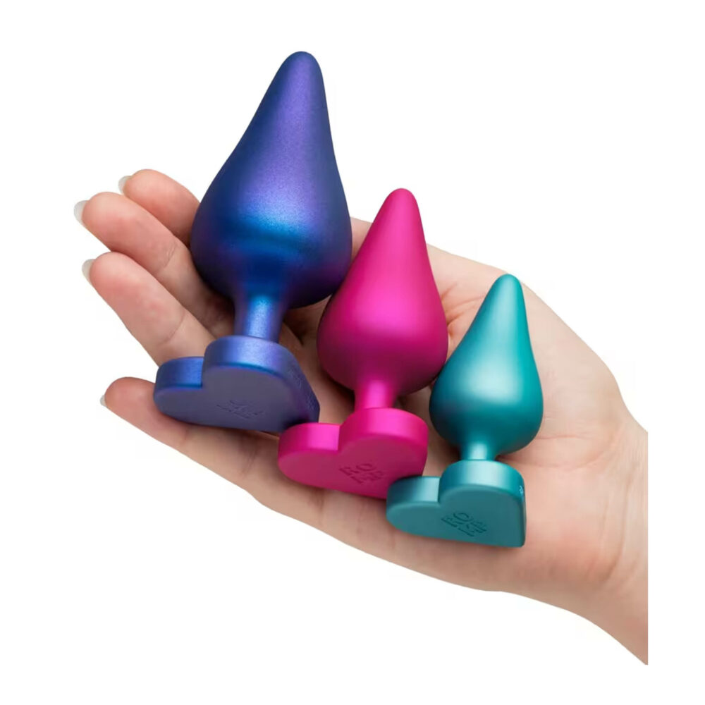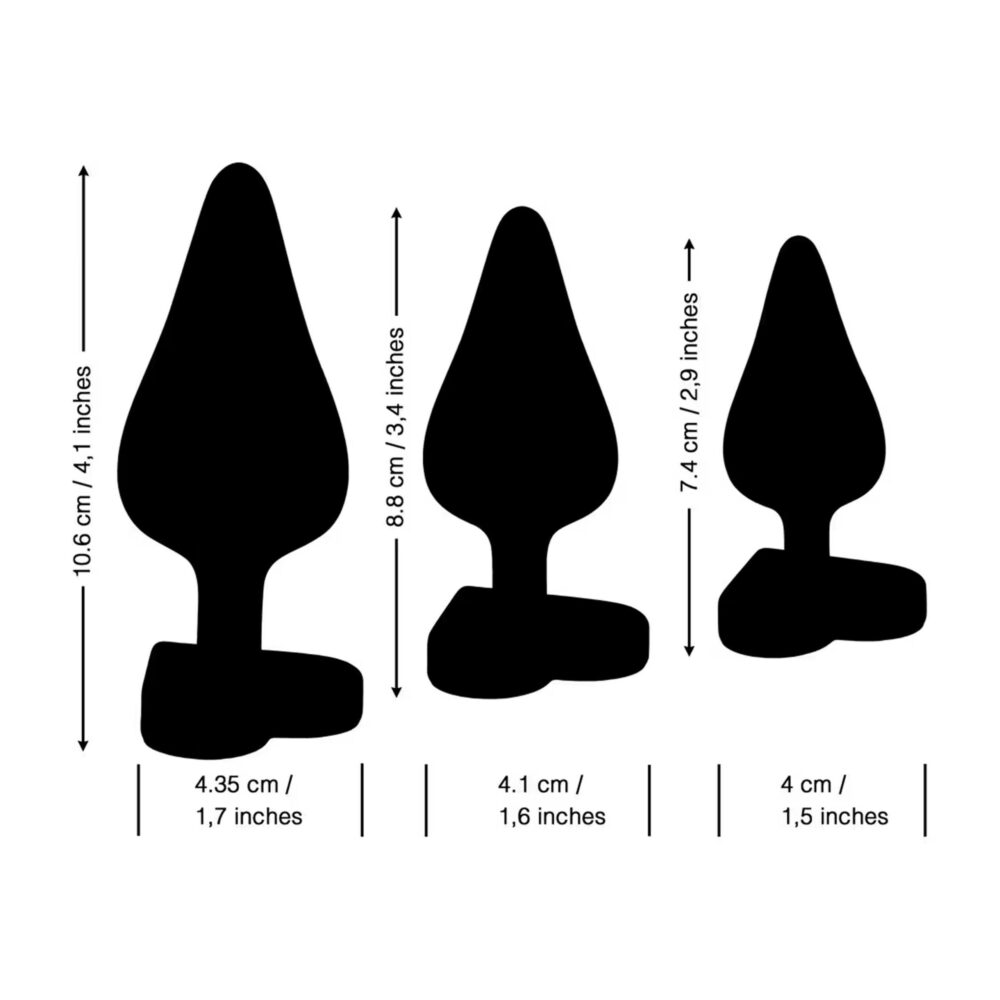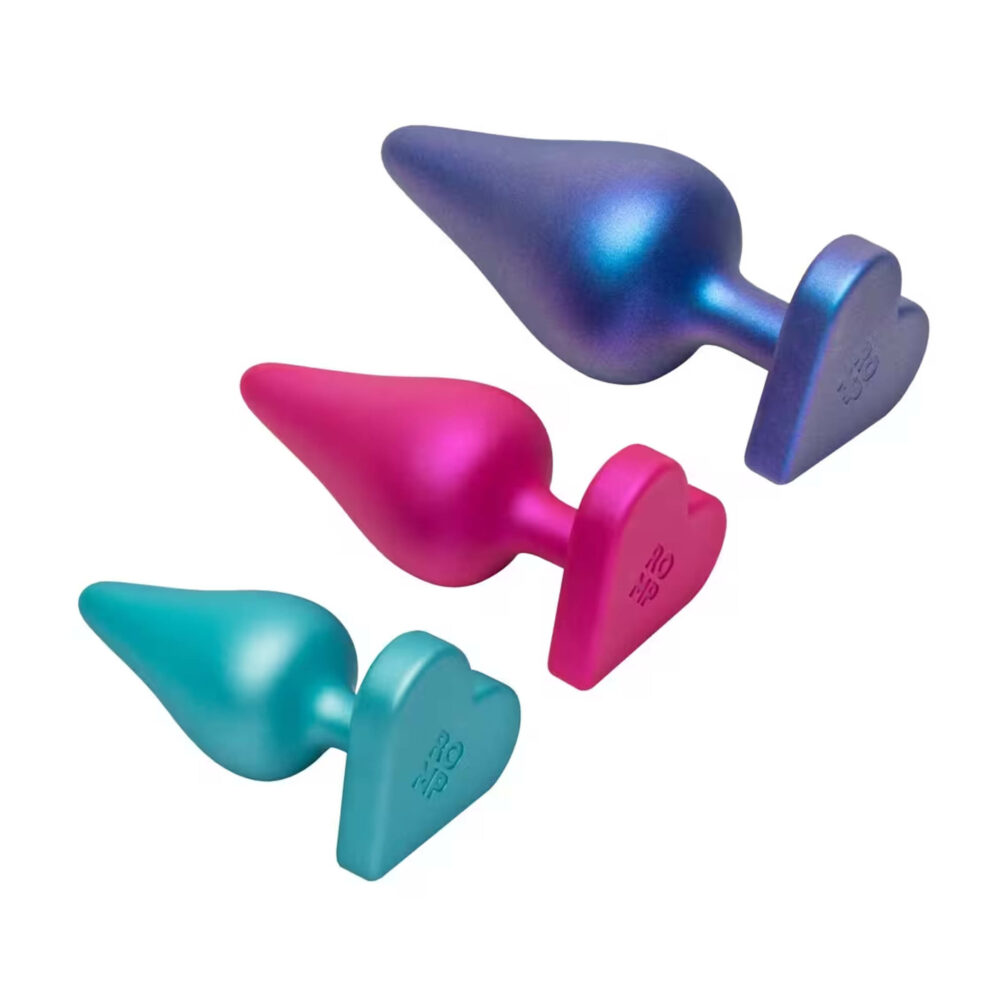 U kompletu za analni trening, Luster od ROMP-a, postoje 3 anal plaga i dolaze u različitim veličinama i trendovskim bojama sa prelepim metalnim šljokicama. Savršeni su za rektalnu stimulaciju i trening istezanja. Svaki glatki plag u obliku konusa ima nežan vrh i analni plag u obliku srca. Sva tri plaga su izuzetno fleksibilna i napravljena od baršunasto mekog silikona za lako umetanje i maksimalnu udobnost. Takođe se savršeno prilagođavaju i intimnoj zoni. Odlični su za početnike u analnom zadovoljstvu!