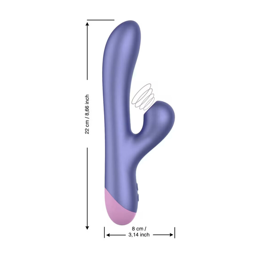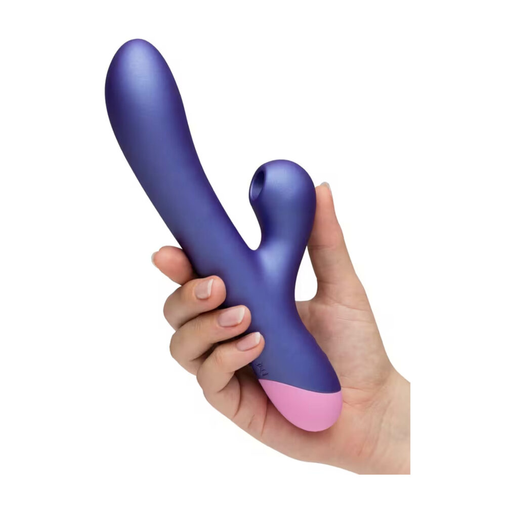 Pulse zečji vibrator iz ROMP-a koji se lako koristi ima i klitoralni pulsator. Ovaj vibrator pruža dvostruku stimulaciju u prelepom svetlucavom metalnom izgledu. Zadovoljava vaginu intenzivnim vibracijama (10 režima) i istovremeno uživa u klitorisu jedinstvenim talasima stimulacije Pleasure Air (5 režima). Obe funkcije se mogu lako podesiti pomoću dugmadi na igrački. Mogu se kontrolisati i odvojeno. 2 tiha, ali moćna motora takođe pružaju pouzdanu stimulaciju. Pulse se može koristiti i u kadi ili pod tušem jer je vodootporan. Pulse je napravljen od baršunasto glatkog silikona i to znači da se osovina može vrlo lako umetnuti. Puls se takođe savršeno prilagođava klitorisu. Maksimalna udobnost tokom sinhronizovane stimulacije.