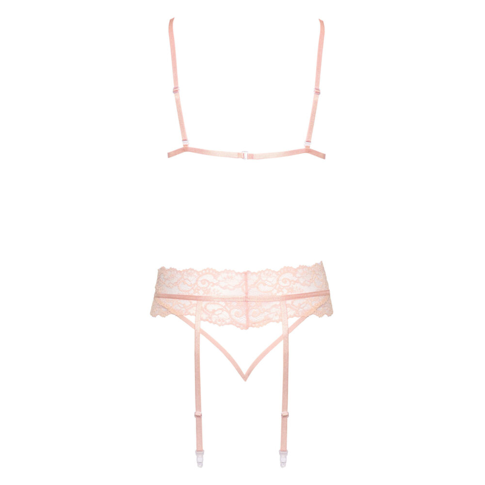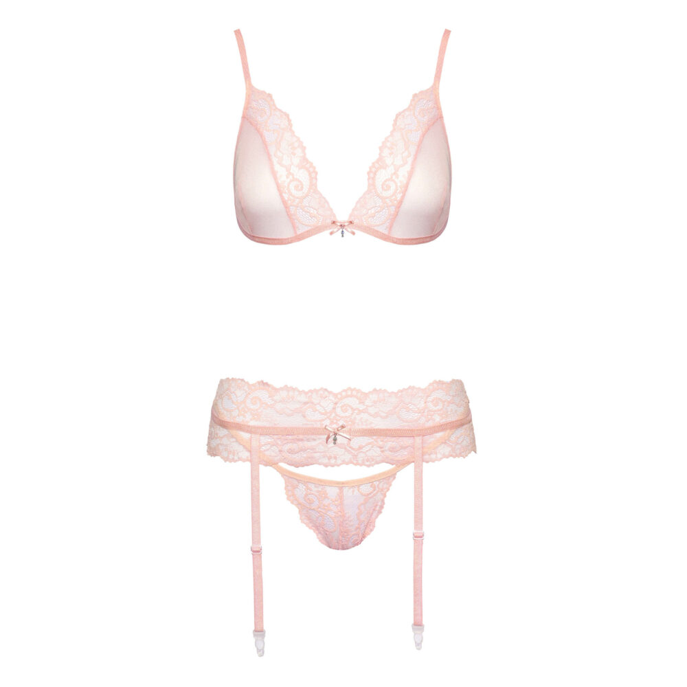 Roze čipkani set veša sa halterima odiše senzualnošću i elegancijom. Set uključuje čipkasti grudnjak koji lepo oblikuje dekolte, nežne gaćice od fine prozračne čipke i haltere koji dodatno naglašavaju ženstvenost i zavodljiv izgled. Romantična nijansa roze boje u kombinaciji sa delikatnim čipkastim detaljima stvara sofisticiran i privlačan izgled, savršen za posebne trenutke ili kada želiš da se osećaš samouvereno i neodoljivo.
