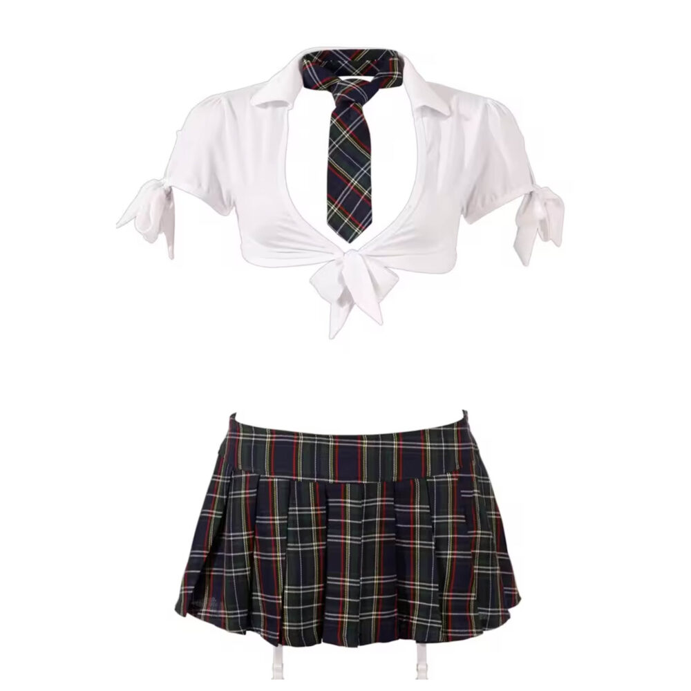 Mini suknja sa strogim vezom i lepršavim zatvaračem sa strane, kratkim topom koji se može vezati napred i rukavima koji se takođe mogu vezati, i gaćica bez međunožja sa seksi špijunkom.