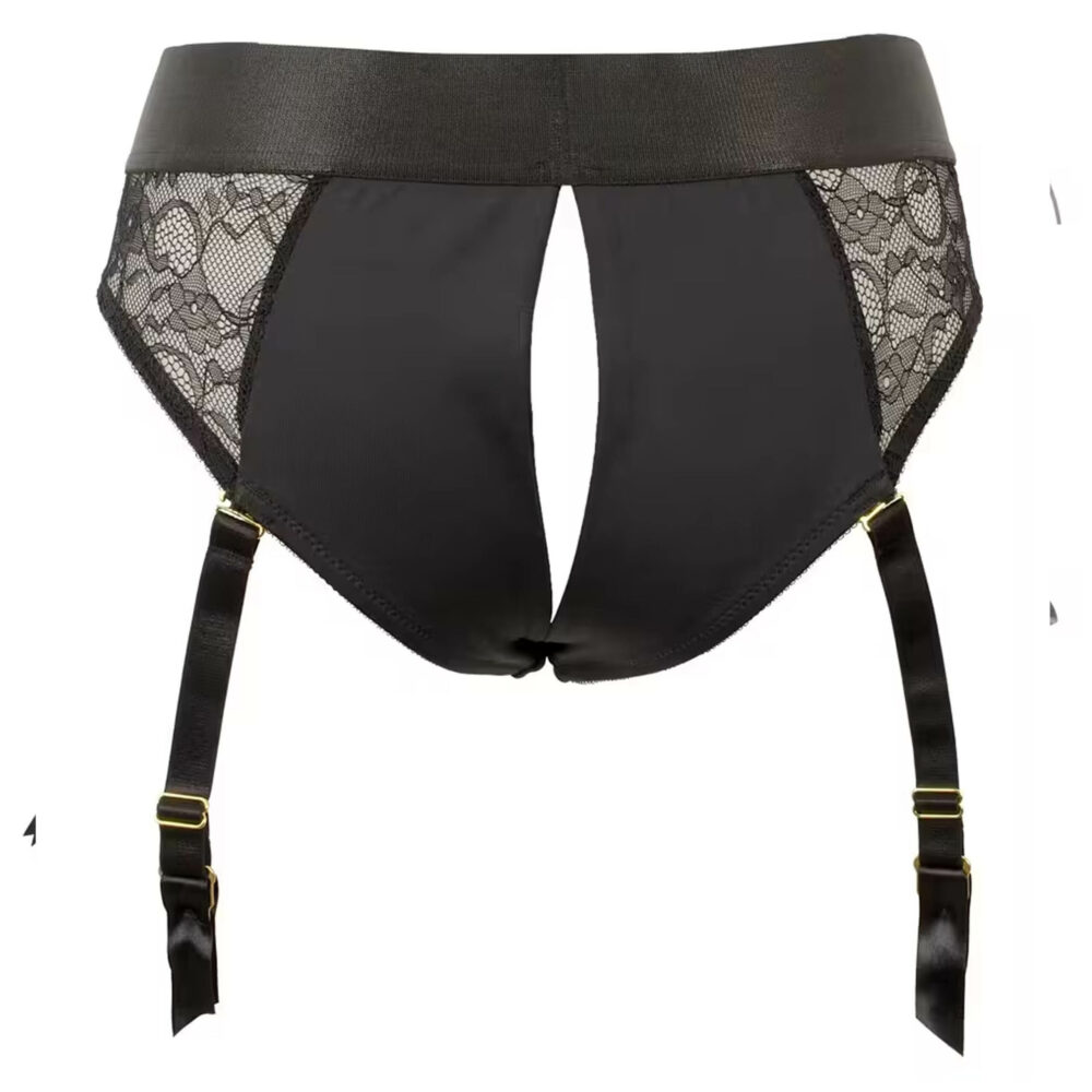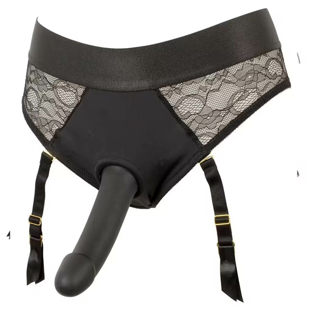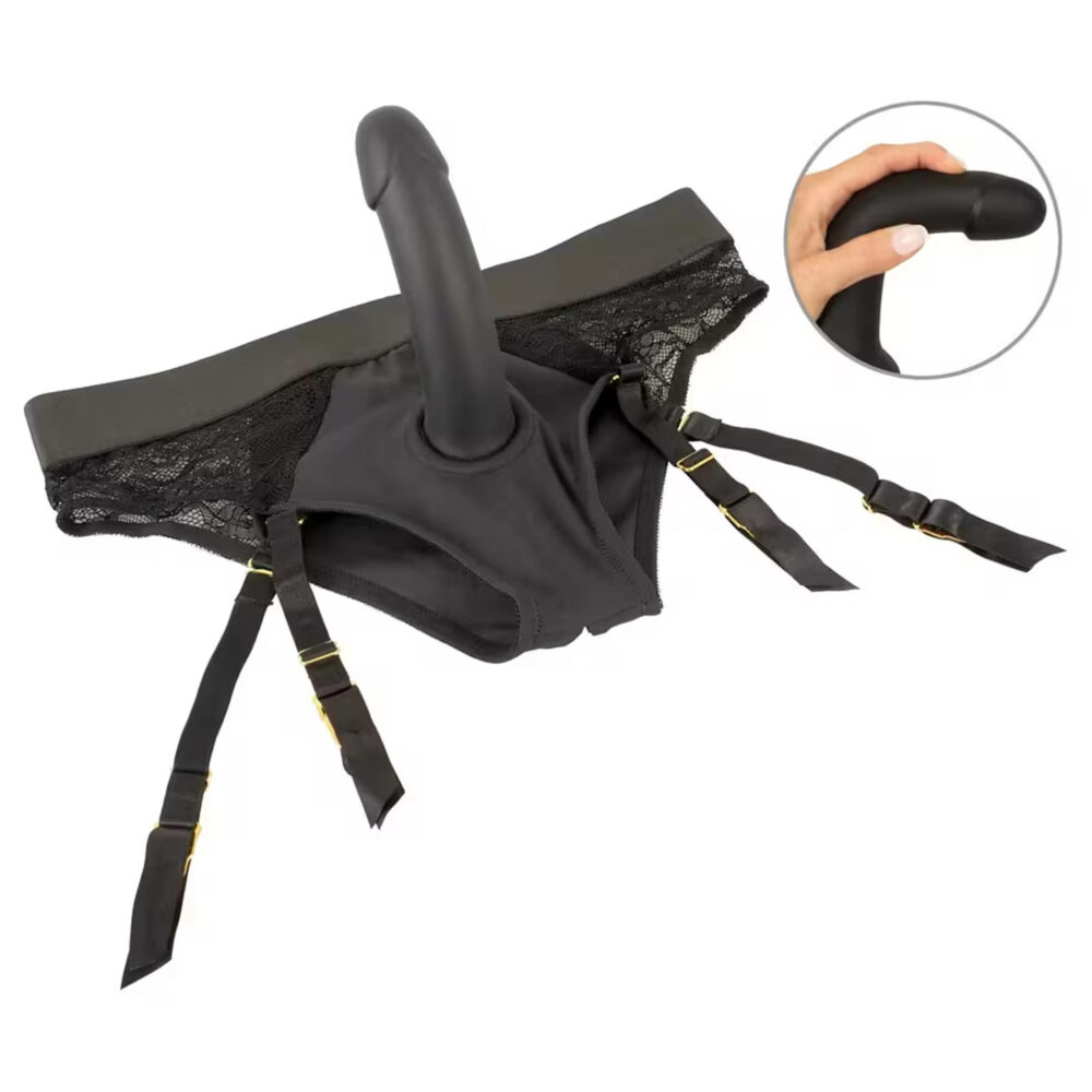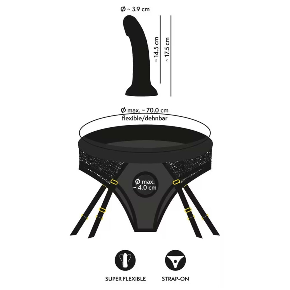 Crne strap-on gaćice su napravljene od rastegljive mešavine mikrofibera i čipke, što ih čini veoma udobnim za nošenje. Imaju dvostruki sloj materijala na prednjoj strani sa umetkom i diskretnim, rastegljivim prstenom. Uključeni dildo sa vakuumskom čašicom može se brzo i lako umetnuti u prsten na prednjoj strani gaćica. Bilo koji drugi dildo/vibrator sa vakuumskom čašicom (Ø maks. 4 cm) takođe se može koristiti sa gaćicama. Gaćice takođe imaju zavodljiv i primamljiv izrez preko zadnjice. Tregeri su podesivi i potpuno uklonjivi. Obim struka/kukova može se rastegnuti do maksimalno 70 cm. 88% poliamid, 10% elastan, 2% pamuk.