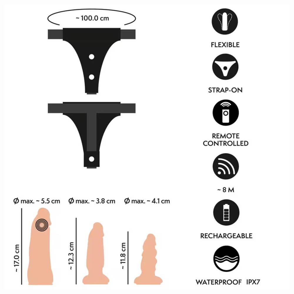 Strap-on pojas napravljen od stilske veštačke kože sa širokim rastegljivim kaiševima je podesiv po veličini tako da sve čvrsto i udobno pristaje. Vibrator i dildi se jednostavno zavrću u 3 otvora pojasa sa svojim kontra pločicama po želji.