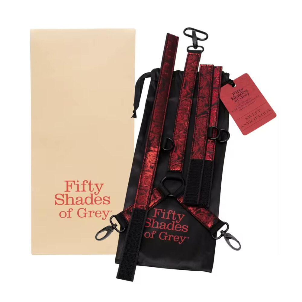 Kragna i lisice Sveet Anticipation Collar i manžetne za zglobove iz Pedeset nijansi sive omogućavaju prijatnu fiksaciju ruku ispred ili iza tela. Ogrlica i lisice imaju D-prstenove tako da se mogu pričvrstiti na kopče srednjeg remena. Meko podstavljeni držači i srednja traka se mogu nositi u oba smera: jedna strana je u crnom kožnom izgledu, a druga strana je u dizajnu crno-crvene satenske ruže. Obujmice se lako postavljaju jer imaju kopče na kuke i omče, a mogu se i podesiti.