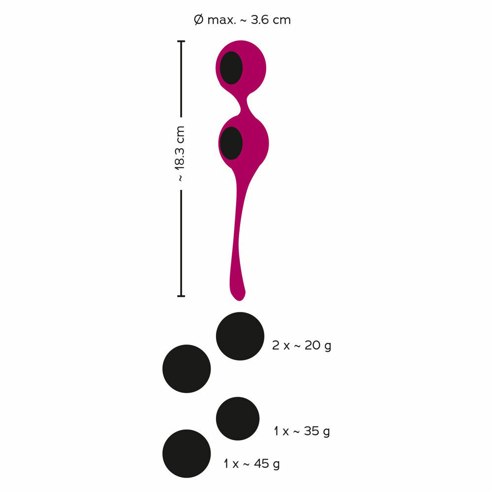 Set ljubavnih loptica je napravljen od baršunasto mekog silikonskog poklopca (24 g) i 4 kuglice (2 k 20 g, 1 k 35 g i 1 k 45 g) koje se lako mogu umetnuti i ukloniti.