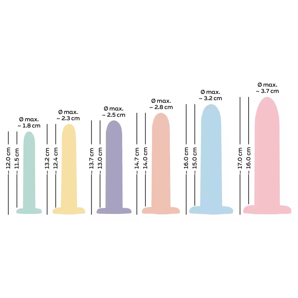 | Dildo set za analno/vaginalno zadovoljstvo i trening istezanja! 6-delni set Six in a Rovw iz You2Toys-a, u različitim pastelnim bojama, veličinama i težinama: Dildo zeleni: ukupna dužina 12 cm, dužina umetanja 11,5 cm, Ø mak 1,8 cm, težina 35 g. Dildo žuti: ukupna dužina 13,2 cm, dužina umetanja 12,4 cm, Ø mak 2,3 cm, težina 67 g. Dildo ljubičasti: ukupna dužina 13,7 cm, dužina umetanja 13 cm, Ø mak 2,5 cm, težina 82 g. Dildo narandžasta: Ukupna dužina 14,7 cm, dužina umetanja 14 cm, Ø mak 2,8 cm, težina 107 g. Dildo plavi: ukupna dužina 16 cm, dužina umetanja 15 cm, Ø mak 3,2 cm, težina 154 g. Dildo roze: ukupna dužina 17 cm, dužina umetanja 16 cm, Ø mak 3,7 cm, težina 223 g. Svaki gladak, prijatno čvrst, napravljen od silikona sa svilenkasto mekom površinom za lako umetanje i optimalnu gipkost. Fleksibilan i savitljiv za savršeno prilagođavanje telu i pokretima. Svi sa velikom usisnom bazom, koja takođe obezbeđuje analno rukovanje bez klizanja. Usisna osnova čvrsto prijanja na sve glatke površine, omogućavajući upotrebu bez ruku. Svaki od ovih dildoa sa usisnom bazom takođe se može lako umetnuti u trake i pojaseve. Silikon, PU. |