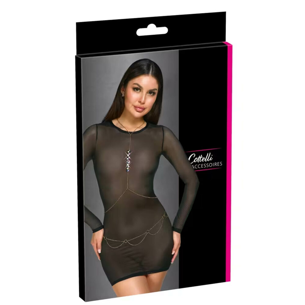 Zlatni lanac za telo od Cottelli ACCESSOIRES ima 6 velikih blistavih hologramskih dragulja između grudi. Ovaj glamurozni komad nakita ima lanac za vrat, grudi i struk, i lanac za kukove. Na lancu za kukove nalazi se malo ukrasa od lanca i prstenova. Može se podesiti na različitim mestima – na vratu i preko zadnjice zahvaljujući kukicama za kopčanje. Može se nositi samostalno na golom telu za moderan i erotičan izgled. Lanac za telo se takođe može stilski kombinovati sa kupaćim kostimima ili uskim odevnim kombinacijama.