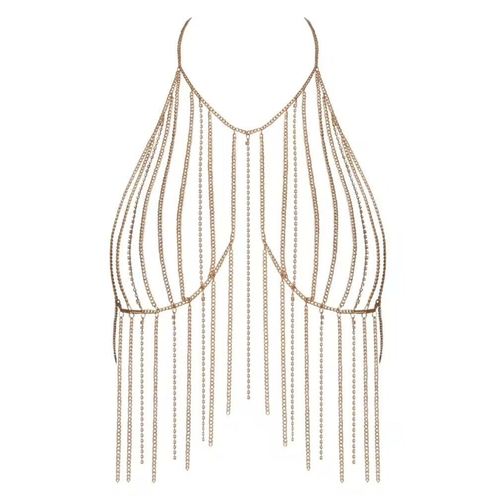 Zlatni top sa lancem od Cottelli ACCESSOIRES je delimično prekriven ukrasom od veštačkih kristala. Elegantni dragulj ima kopču na zadnjem delu vrata i pozadi za podešavanje gornjeg dela. Ostatak leđa je gol. Može se nositi na golom telu za moderan i erotičan izgled. Sjajni izgled sa lancem može se nositi i sa stilskim kupaćim kostimima ili uskim odevnim kombinacijama.