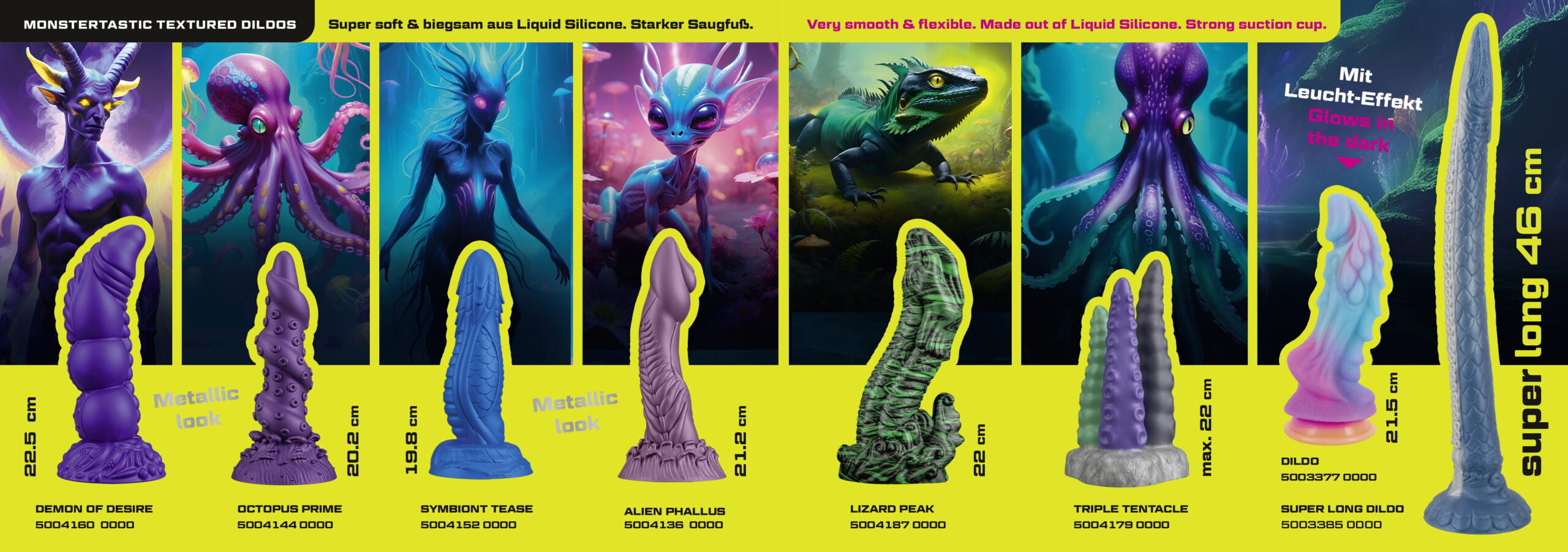 Monster i fantazijski dizajni inspirisani su mitologijom, fantastikom, video igrama i alternativnom erotikom. Šarene boje, nepravilni oblici, pipci, grebeni i neočekivane teksture stvaraju potpuno novo iskustvo užitka. Ovakve igračke ne nude samo stimulaciju, već i beg u svet mašte, gde pravila ne važe, a želje mogu slobodno da se istražuju. Brend Beastly Cocks je jedan od vodećih u ovom svetu fantazije, zato su brzo postali favorit u našoj ponudi.